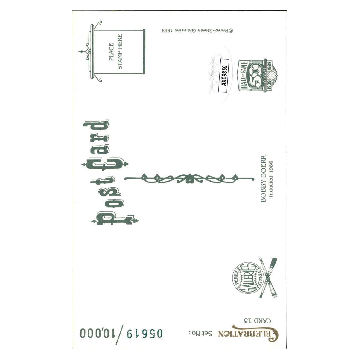 Bobby Doerr Boston Red Sox Autographed Signed Perez Steele 1989 Postcard #5619/10000 (JSA COA #AX09859)