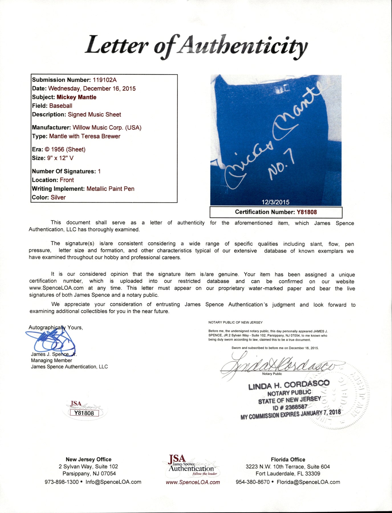 Mickey Mantle New York Yankees Autographed Signed Framed 9x12 "I Love Mickey" Music Sheet (JSA LOA)