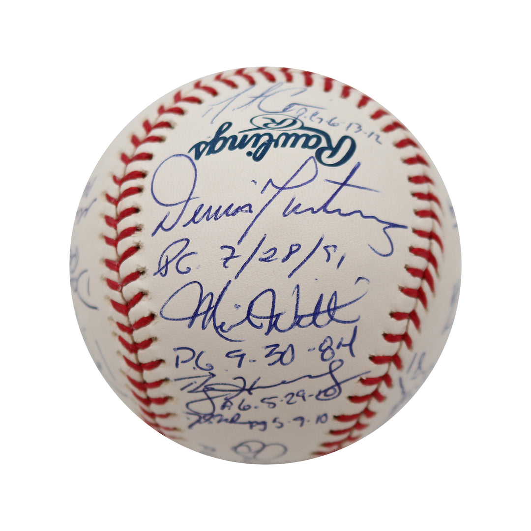 This OML Bud Selig baseball has been autographed by 16 members of the exclusive Perfect Game Club with each adding the date of their feat.  One of the nicest example you can add to your collection.  The ball has been signed by Larsen, Bunning, Halladay, Koufax, Johnson, Buehrle, Cone, Wells, Hernandez, Witt, Martinez, Cain, Braden, Humber, Barker and Browning.  Autographs and inscriptions have been authenticated by Beckett.