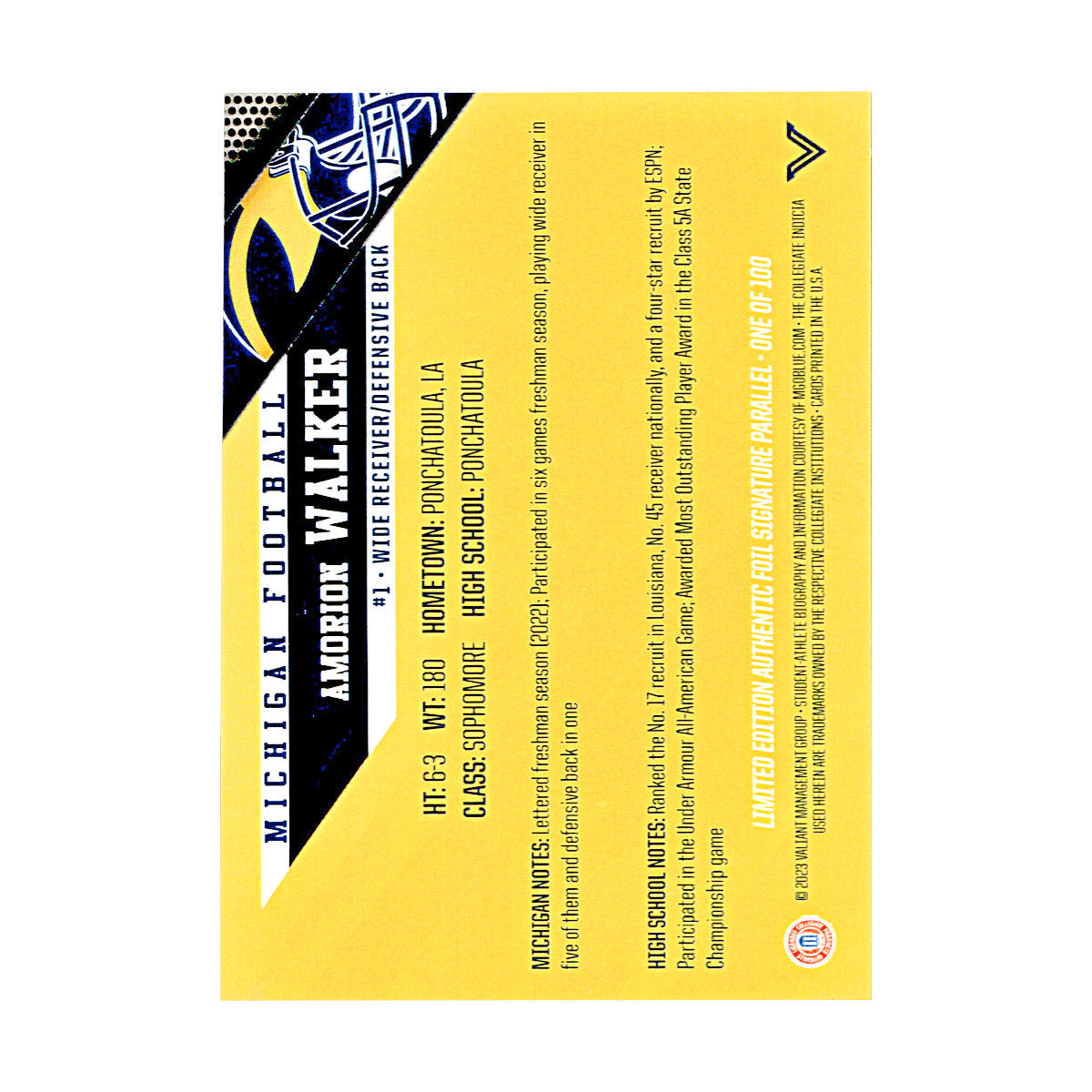 amorion walker michigan wolverines autographed signed valiant limited edition foil signature parallel trading card (CX champions circle LOA)