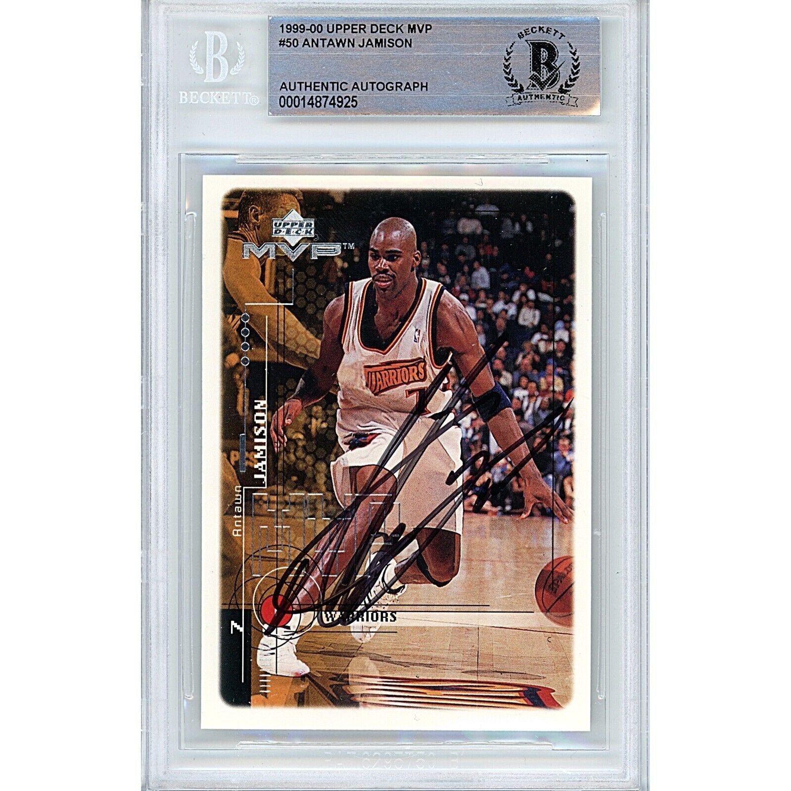This trading card from the 1999-00 Upper Deck MVP set features Antawn Jamison's hard-signed autograph authenticated by Beckett Authentication Services. The card, numbered 50, is encapsulated and authenticated, ensuring its authenticity. Jamison, an experienced player with notable teams including the Golden State Warriors, Los Angeles Lakers, and North Carolina Tar Heels, has signed this card in black ink. Made with high-quality card stock and metal, the card is a standard size. A valuable addition to any basketball card collection, this autographed card is a must-have for fans of Jamison. Signed in black Sharpie. This Antawn Jamison Autographed Golden State Warriors 1999-2000 Upper Deck MVP Basketball Card #50 has been authenticated and encapsulated by Beckett Authentication Services (BAS). Certificate Number 00014874925.