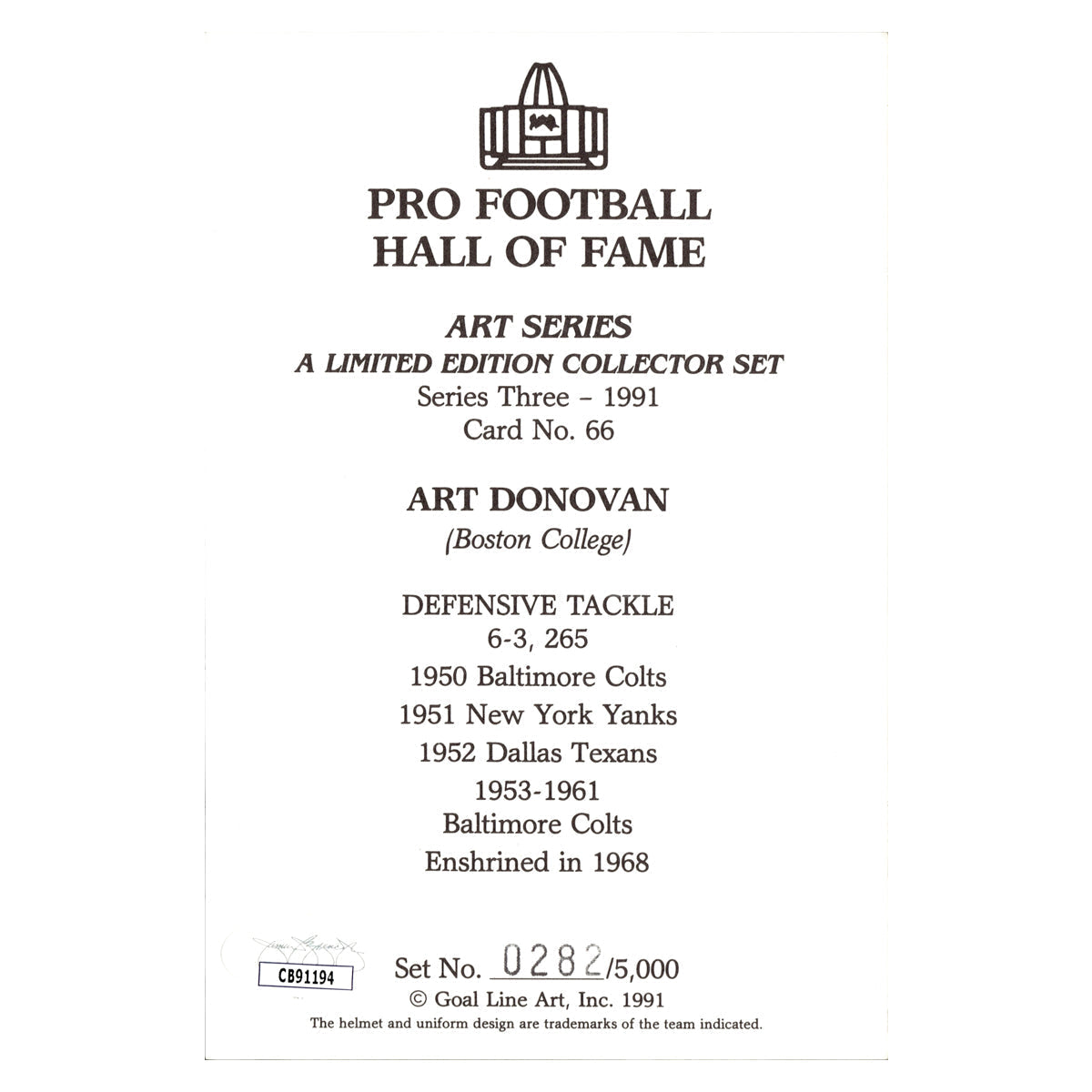 Art Donovan Baltimore Colts Autographed Signed Pro Football Hall Of Fame Goal Line Art Card #282/5000 (JSA COA #CB91194)