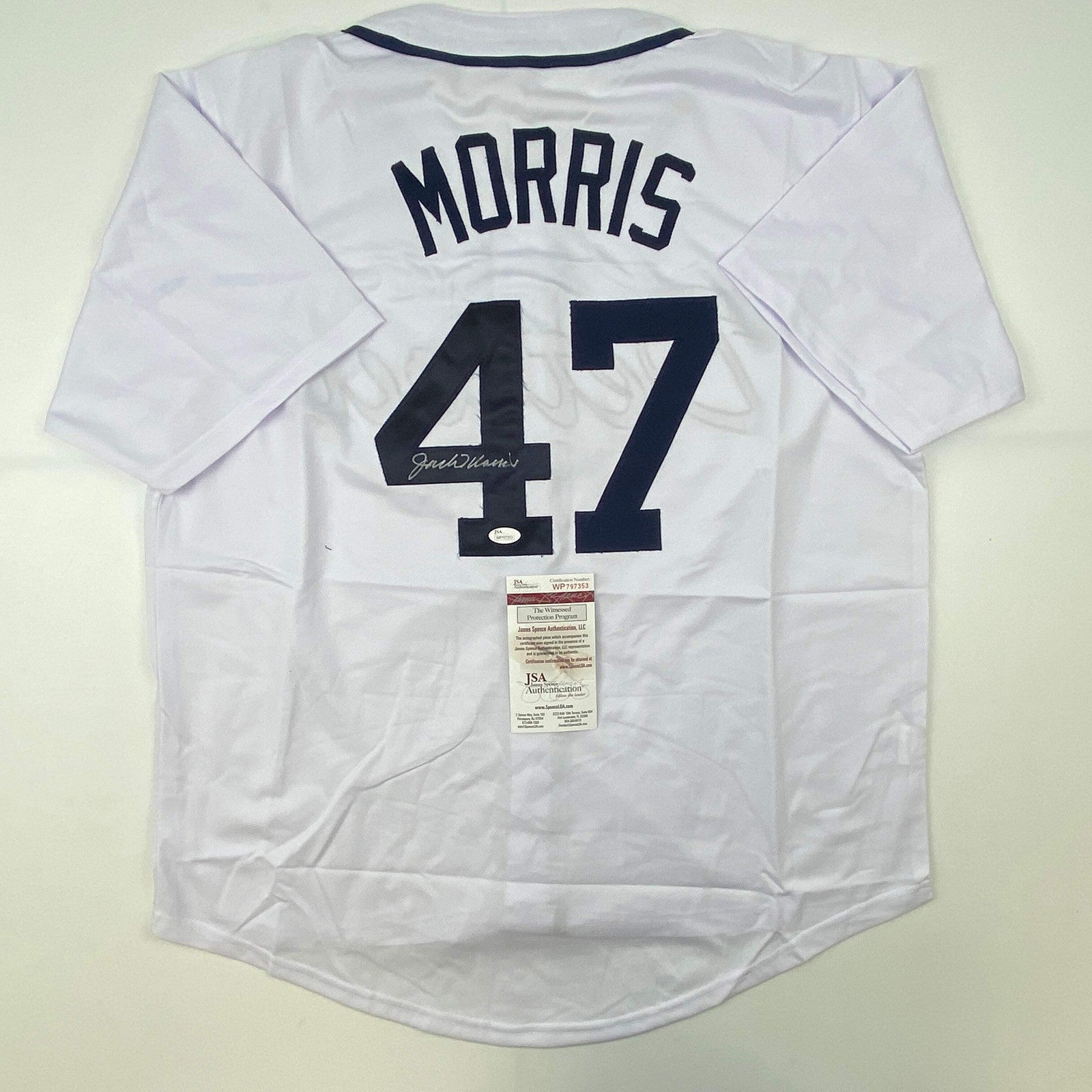 autographed/signed jack morris detroit white baseball jersey JSA COA