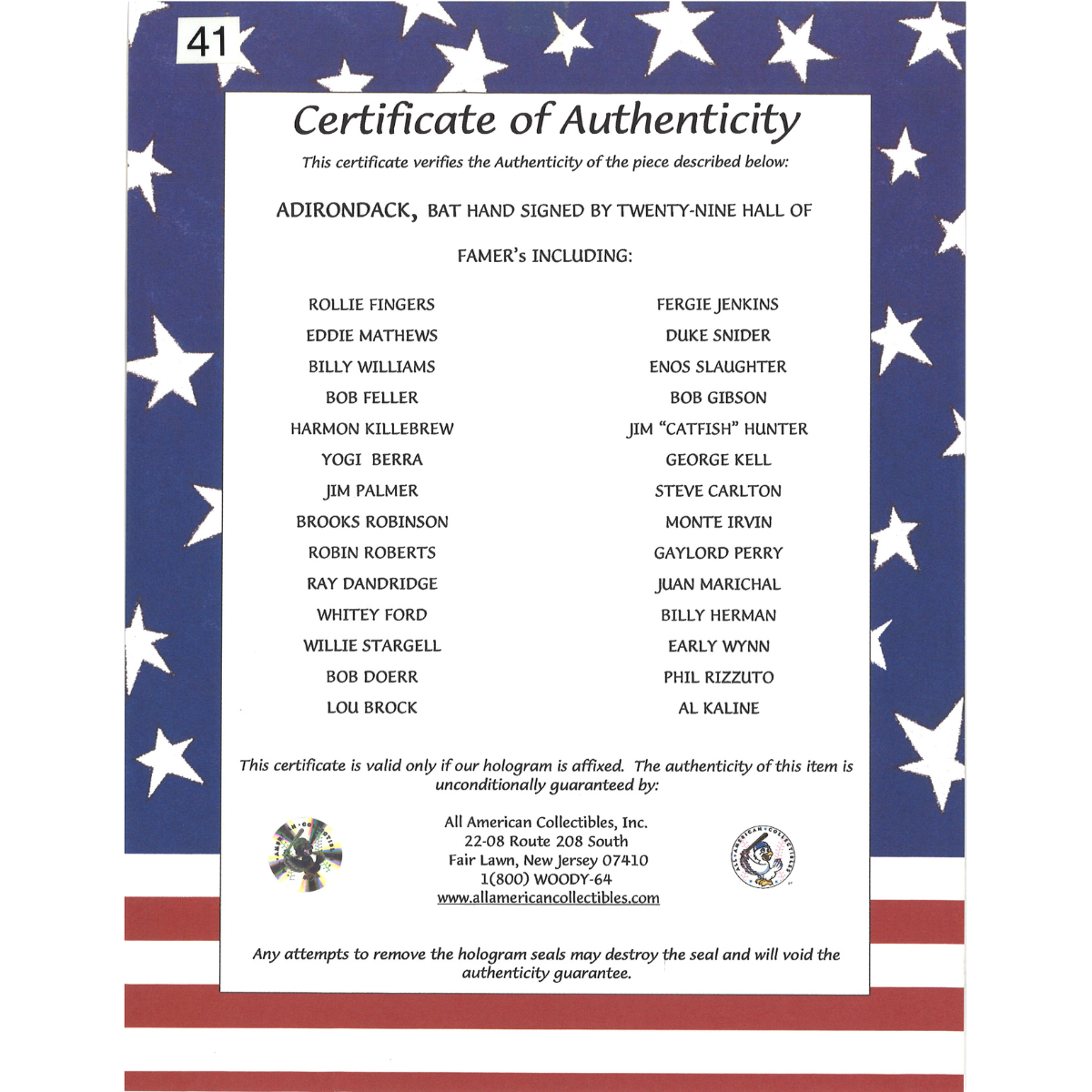 berra, ford, gibson autographed multi signed hall of famers adirondack bat all american LOA