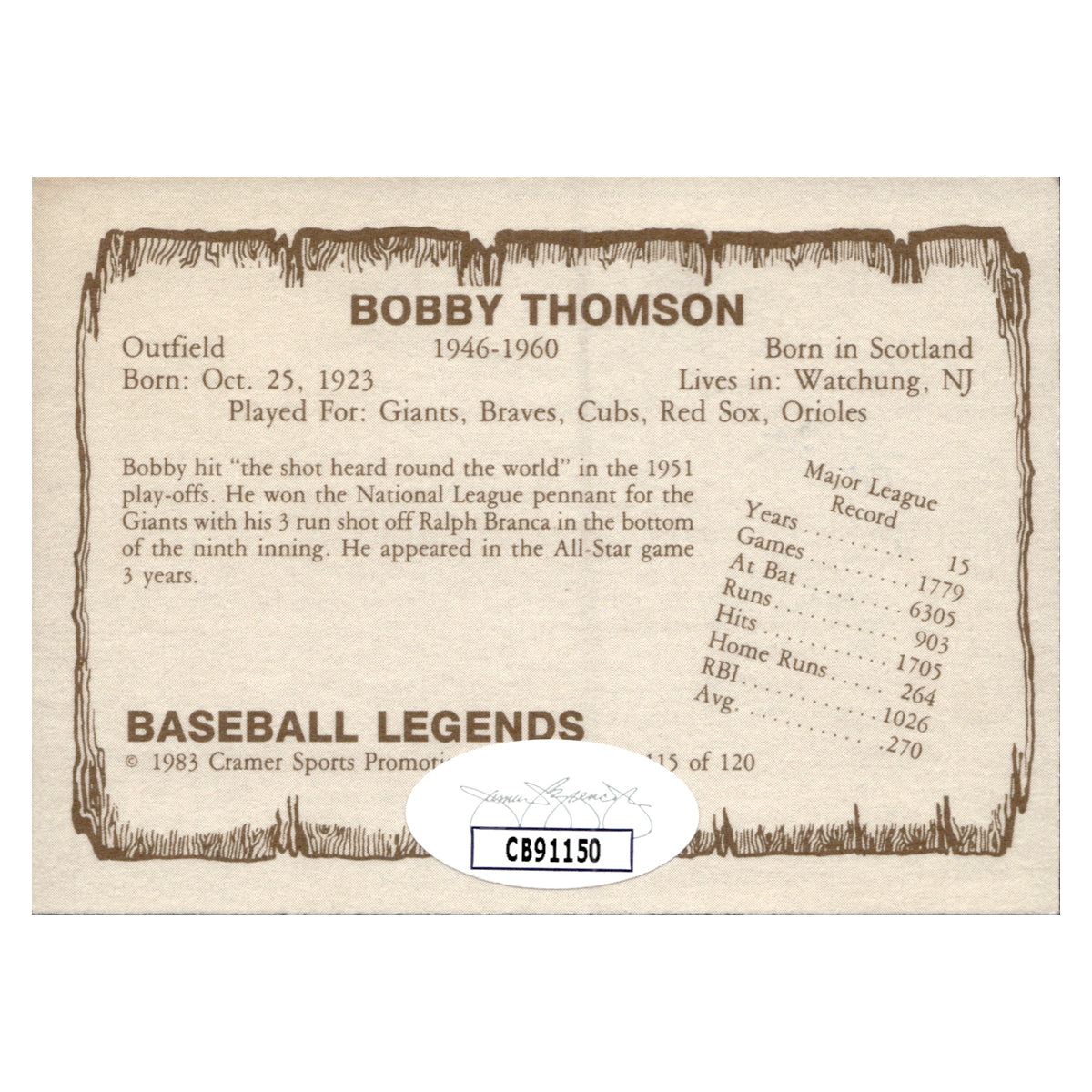 bobby thomson new york giants autographed signed 1981 cramer baseball legends (JSA COA #cb91150)