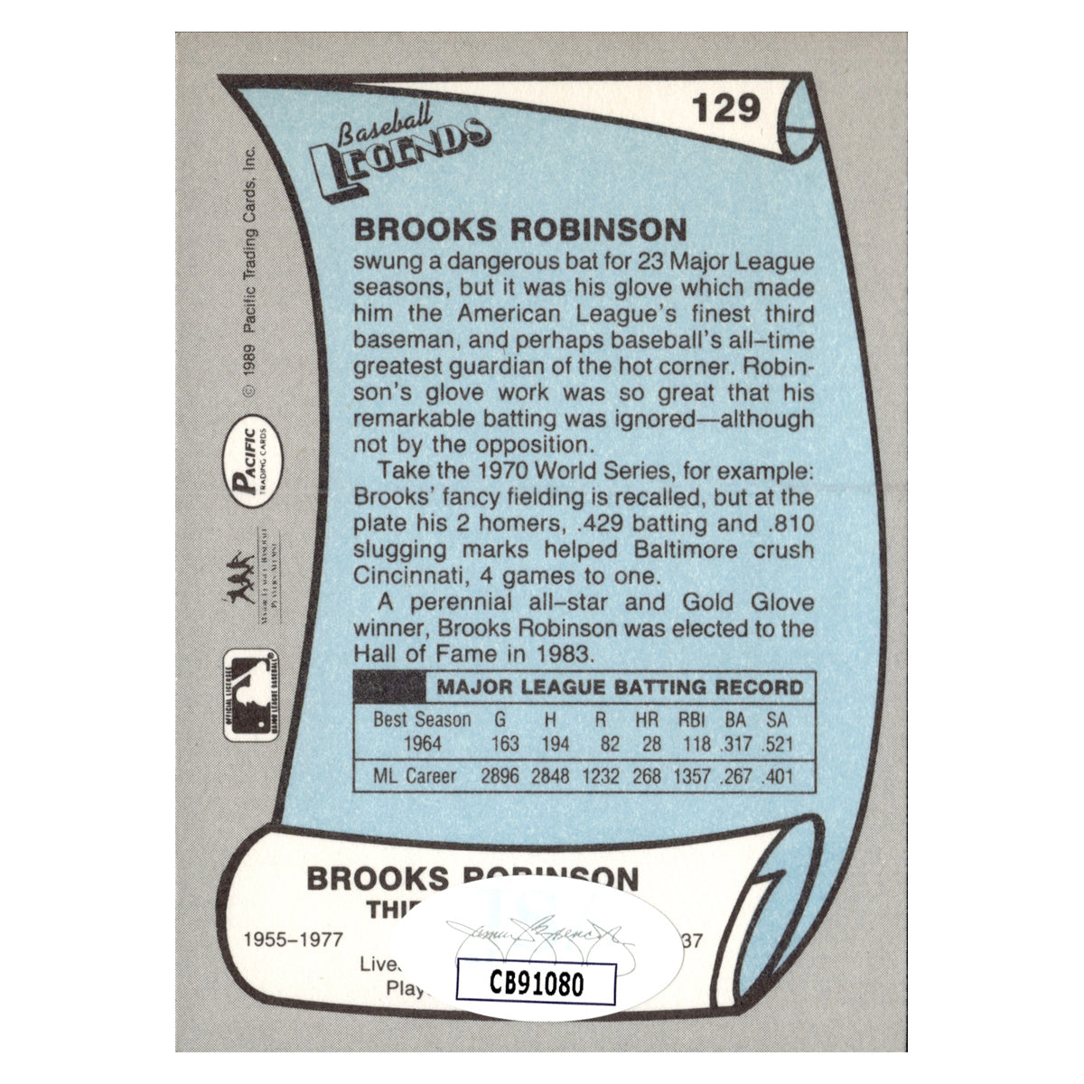 brooks robinson baltimore orioles autographed signed 1989 pacific baseball legends (JSA COA #cb91080)