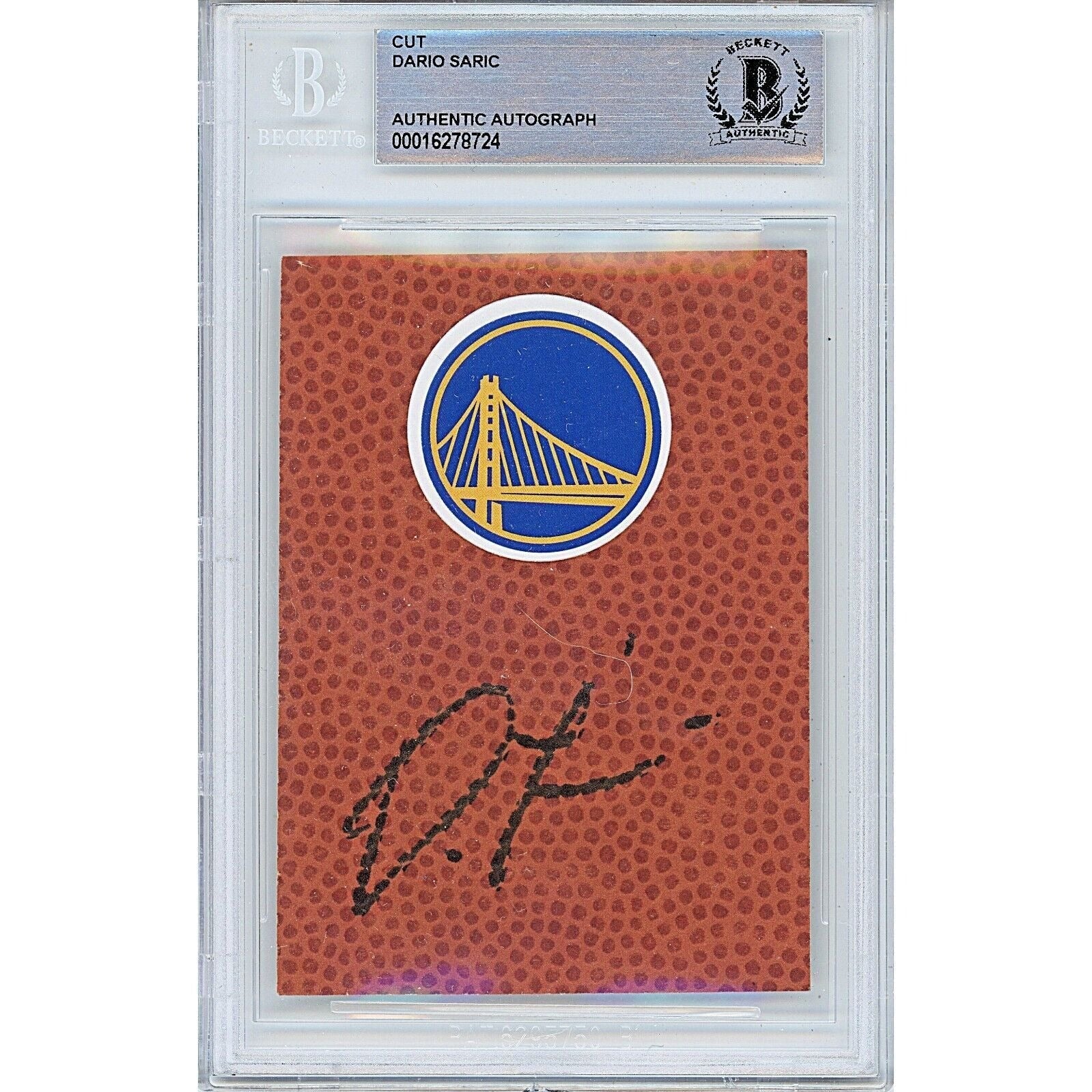 This Dario Saric autographed basketball cut is a valuable addition to any Golden State Warriors fan's collection. The signature has been officially authenticated and is protected in a slab by Beckett Authentication Services (BAS). This is a rare item for any sports memorabilia collector, so don't pass up the opportunity to add it to your own collection. Signed in Black Sharpie. Dario Saric Autographed Golden State Warriors Logo Basketball Signature Cut - Customized. Authenticated and Encapsulated by Beckett Authentication Services (BAS). Certificate Number 00016278724. Encapsulation measures 3.25" x 5", serving as both a COA and a guarantee of the signature's authenticity for the buyer.