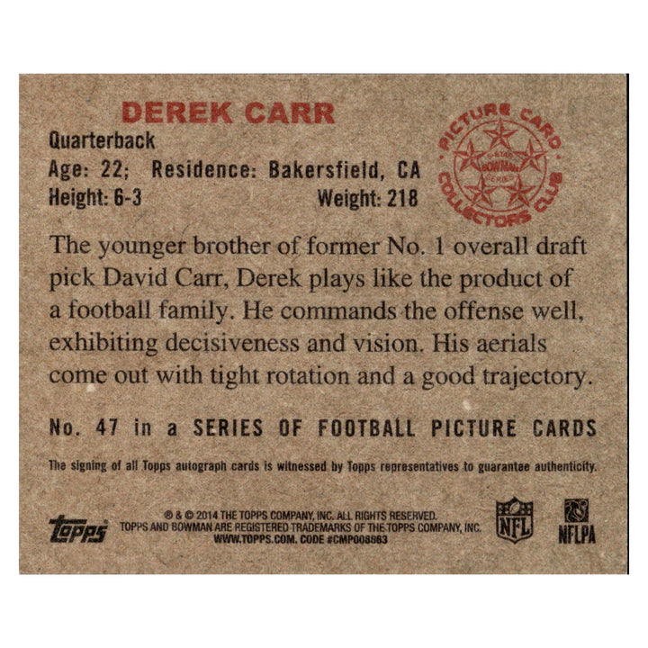 Derek Carr New Orleans Saints 2014 Bowman Mini Rookie Autographs #17/99