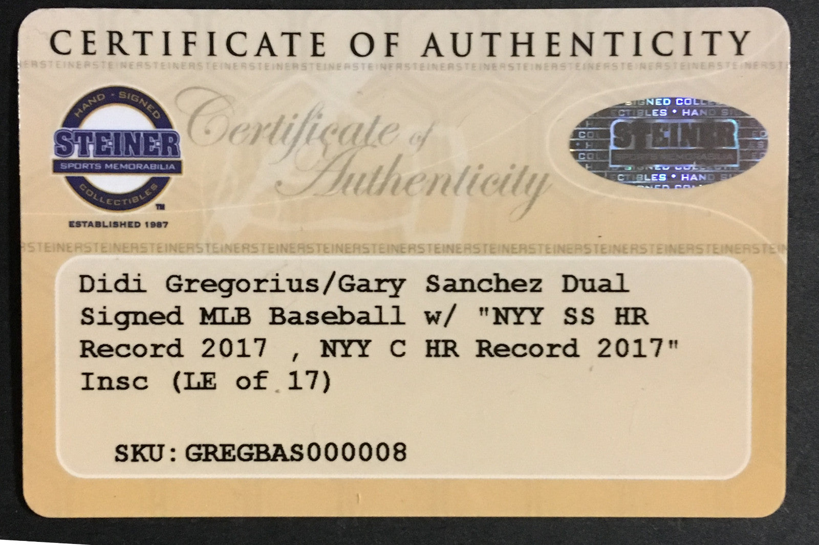 Didi Gregorius Gary Sanchez Yankees signed baseball Most HR auto Steiner 1/17 MT