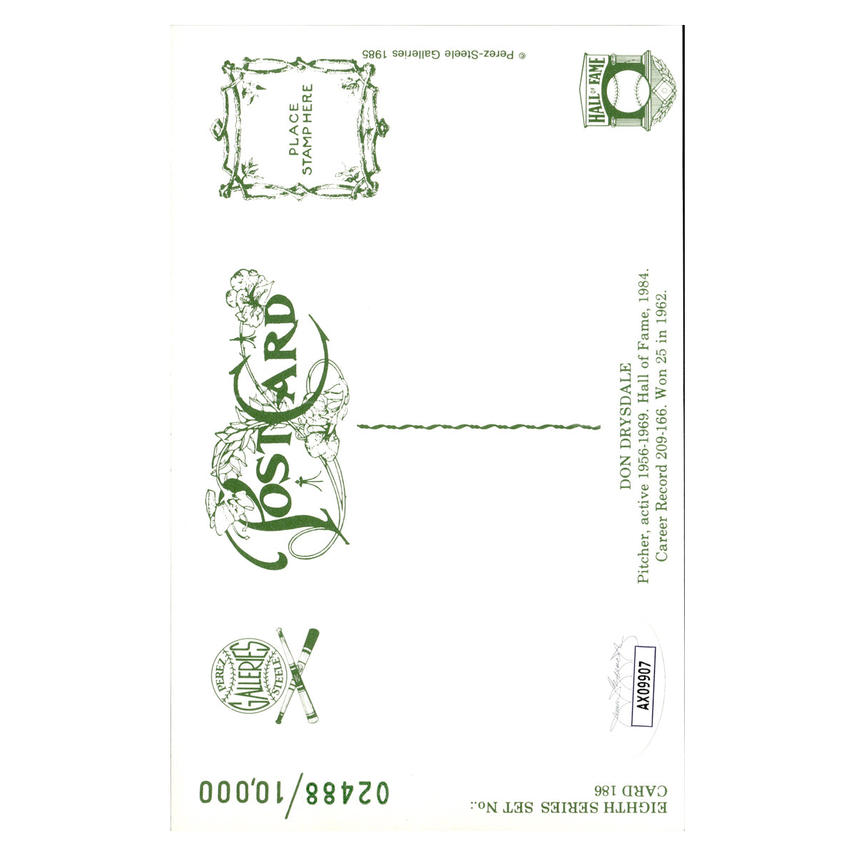 don drysdale los angeles dodgers autographed signed perez steele 1985 postcard #2488/10000 (JSA COA #ax09907)