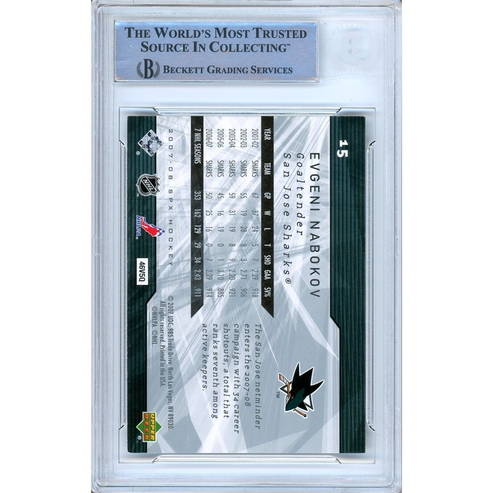 Evgeni Nabokov San Jose Sharks Signed 2007-08 SPx Hockey Card Beckett Auth Auto Slab
