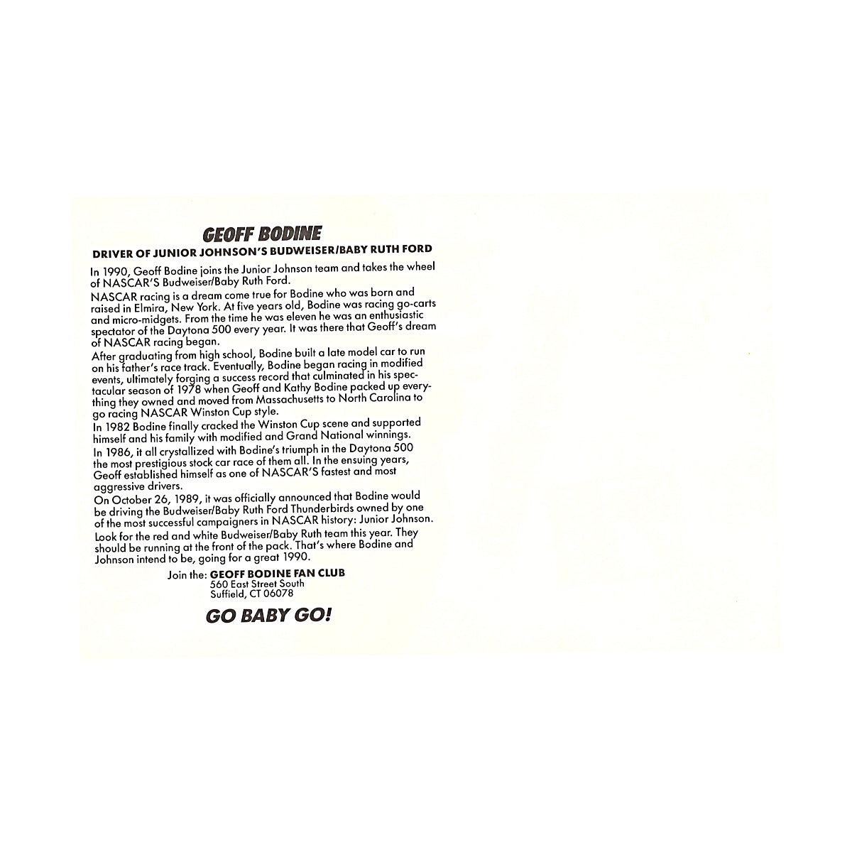 Geoff Bodine Nascar Baby Ruth 6x9 Driver Card - A 6x9 driver card highlighting Geoff Bodine sponsored by Baby Ruth, ideal for NASCAR fans and collectors.