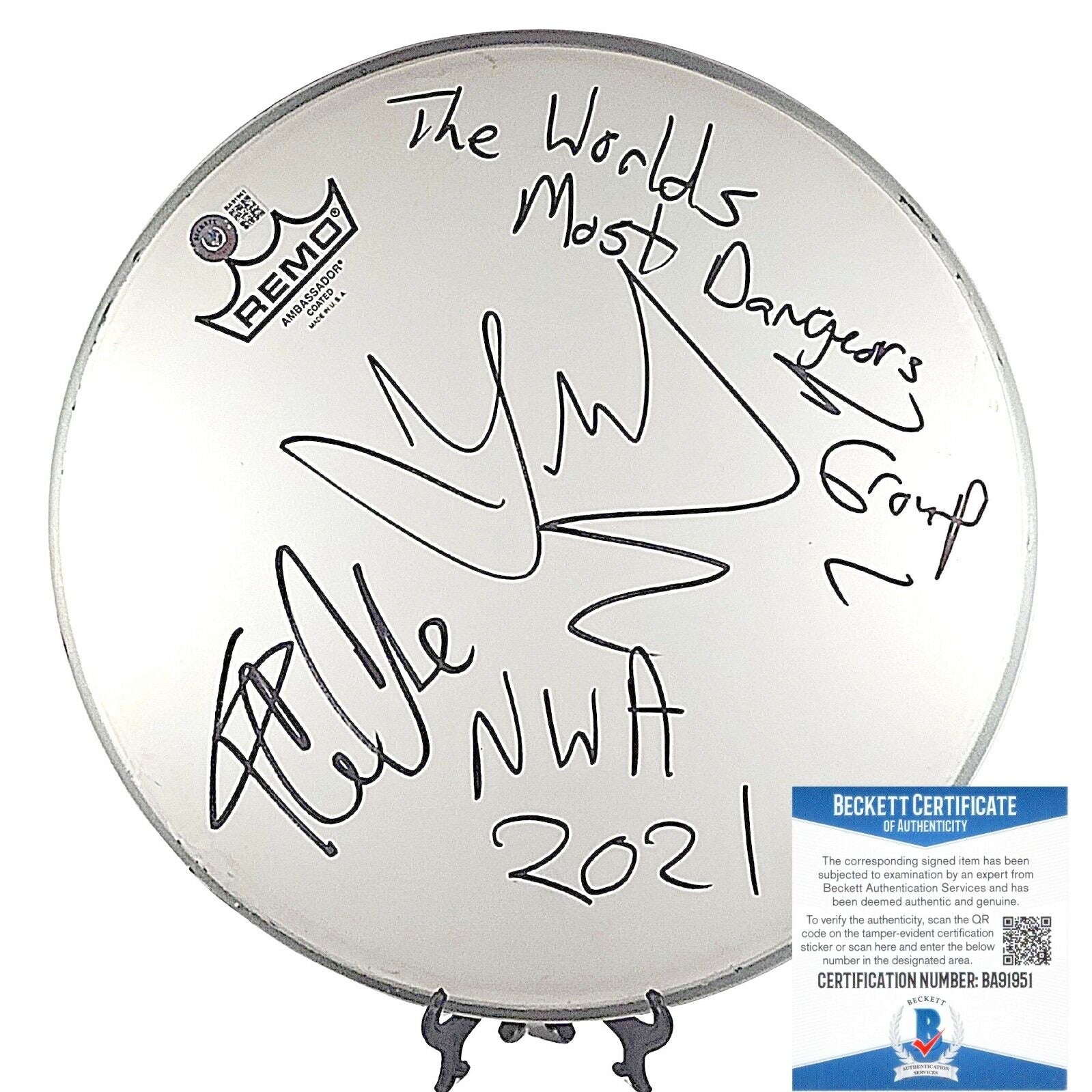 This autographed drum head is essential for any fan of N.W.A and their iconic album, Straight Outta Compton. Signed by Ice Cube and DJ Yella, this genuine Remo drum head is a unique piece of music memorabilia. The autographs have been verified for authenticity by Beckett Authentication Services (BAS), ensuring the value of this collectible. It is perfect for display or as a gift for music enthusiasts, representing the influential rap and hip hop group N.W.A. The item is modified with the autographs, making it an original and genuine piece. Don't pass up the opportunity to own a part of music history with this signed drum head. Signed in Black Sharpie. Original by Ice Cube and DJ Yella, this 12-inch (diameter) Remo drum head features 'The Worlds Most Dangerous Group NWA 2021' Inscription, commemorating NWA's Impact on the Gangsta Rap Music Industry. (Display stand not included with purchase).