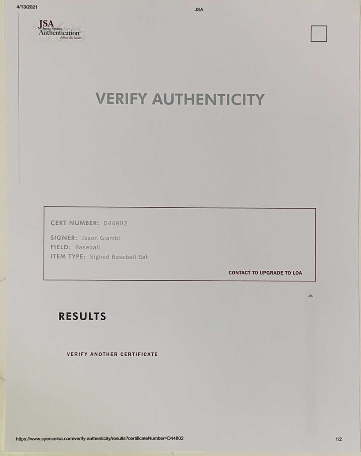 jason giambi signed game issued 34 “ ls baseball bat ins 2000 MVP autograph JSA