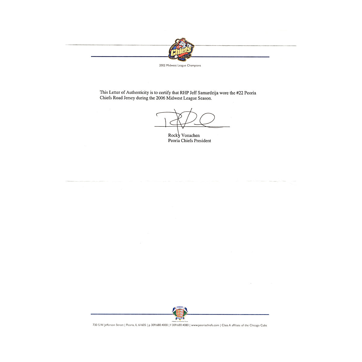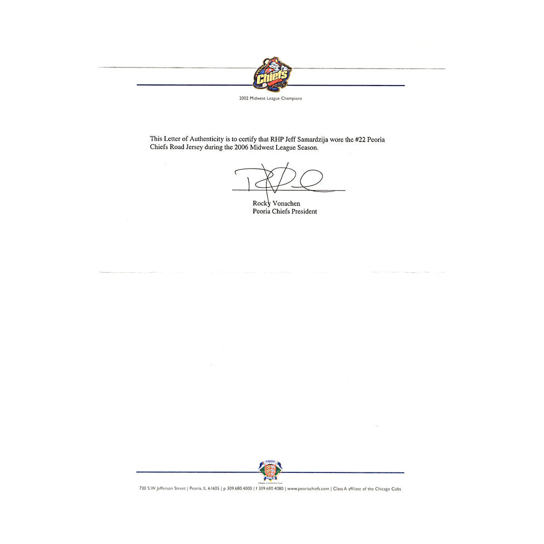 jeff samardzija peoria chiefs 2006 game used gray rawlings road jersey (team LOA)
