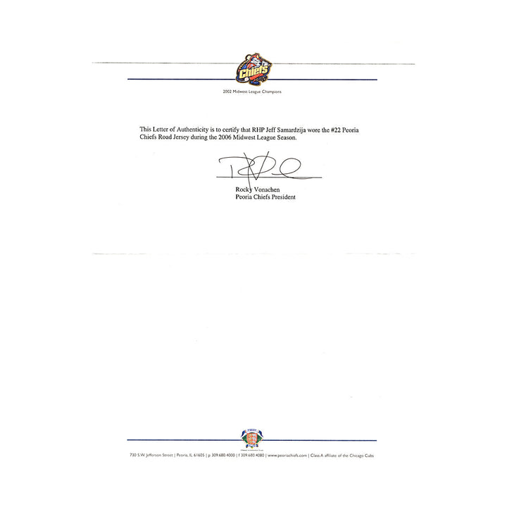 Jeff Samardzija Peoria Chiefs 2006 Game Used Gray Rawlings Road Jersey (Team LOA)