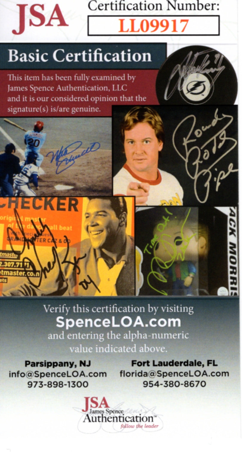 This is a litho art print of Jerry Rice, autographed and certified as authentic by James Spence Authentication Services (JSA) experts. The 11x14 print features Rice's signature in black sharpie and can be verified on the SpenceLOA website using authentication number LL09917. Be sure to click on images to enlarge and check out our collection of Hollywood and music autographs. Some of Rice's notable career achievements include being inducted into the Pro Football Hall of Fame in 2010, being selected 13 times for the NFL Pro Bowl, and leading in career receptions, receiving yards, receiving touchdowns, total touchdowns, and all-purpose yards.