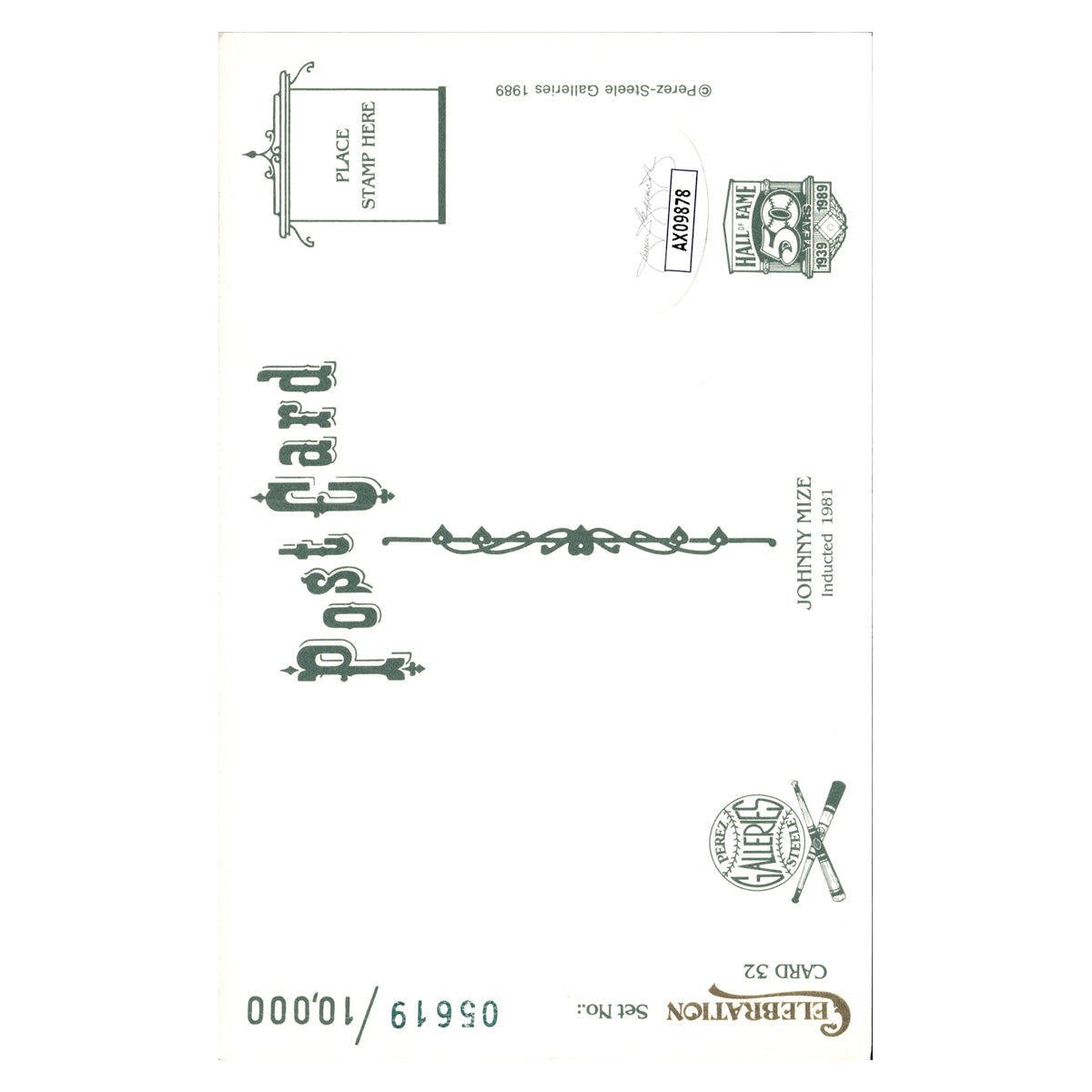 johnny mize new york giants autographed signed perez steele 1989 postcard #5619/10000 (JSA COA #ax09878)