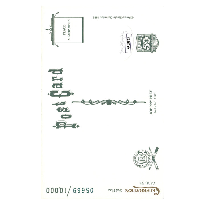 johnny mize new york giants autographed signed perez steele 1989 postcard #5669/10000 (JSA COA #ax09842)