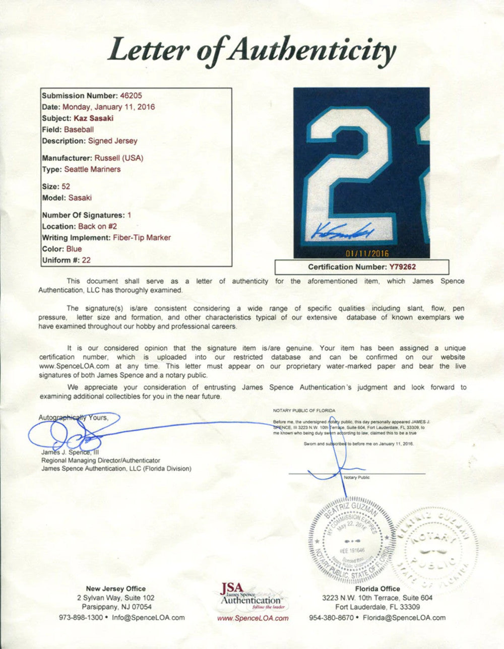 kazuhiro sasaki autographed seattle mariners jersey (JSA)