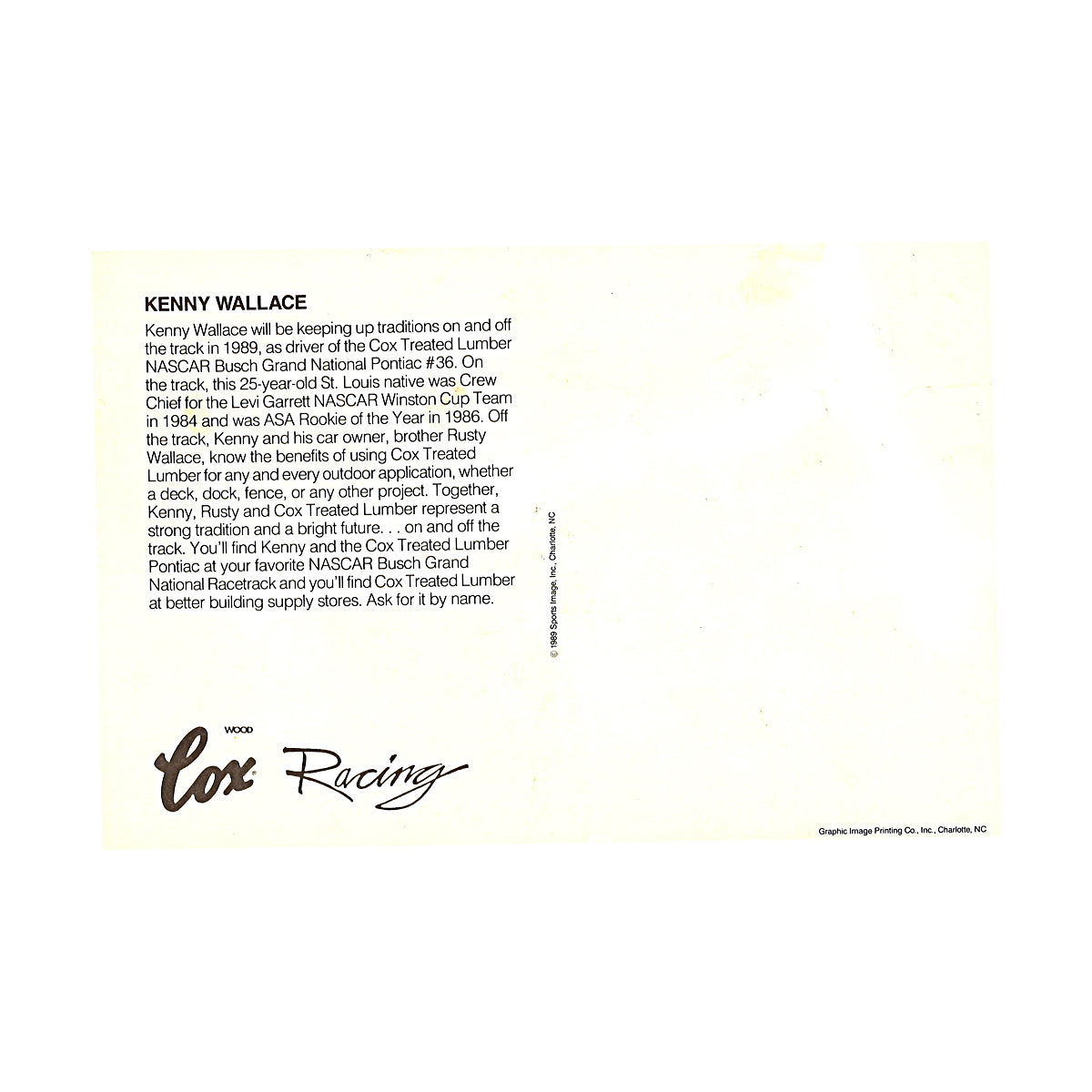 Kenny Wallace Cox Treated Lumbar Beach 6x9 Nascar Postcard - Highlighting Kenny Wallace and his Cox-sponsored NASCAR vehicle, this 6x9 postcard is great for collectors of 1990s-era racing.