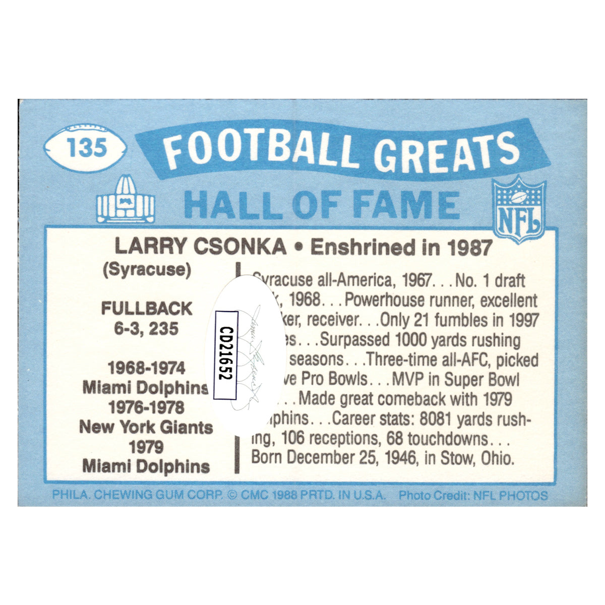 larry csonka miami dolphins autographed signed 2025 swell greats pro football hall of fame goal 25th anniversary card (JSA COA #cd21652)