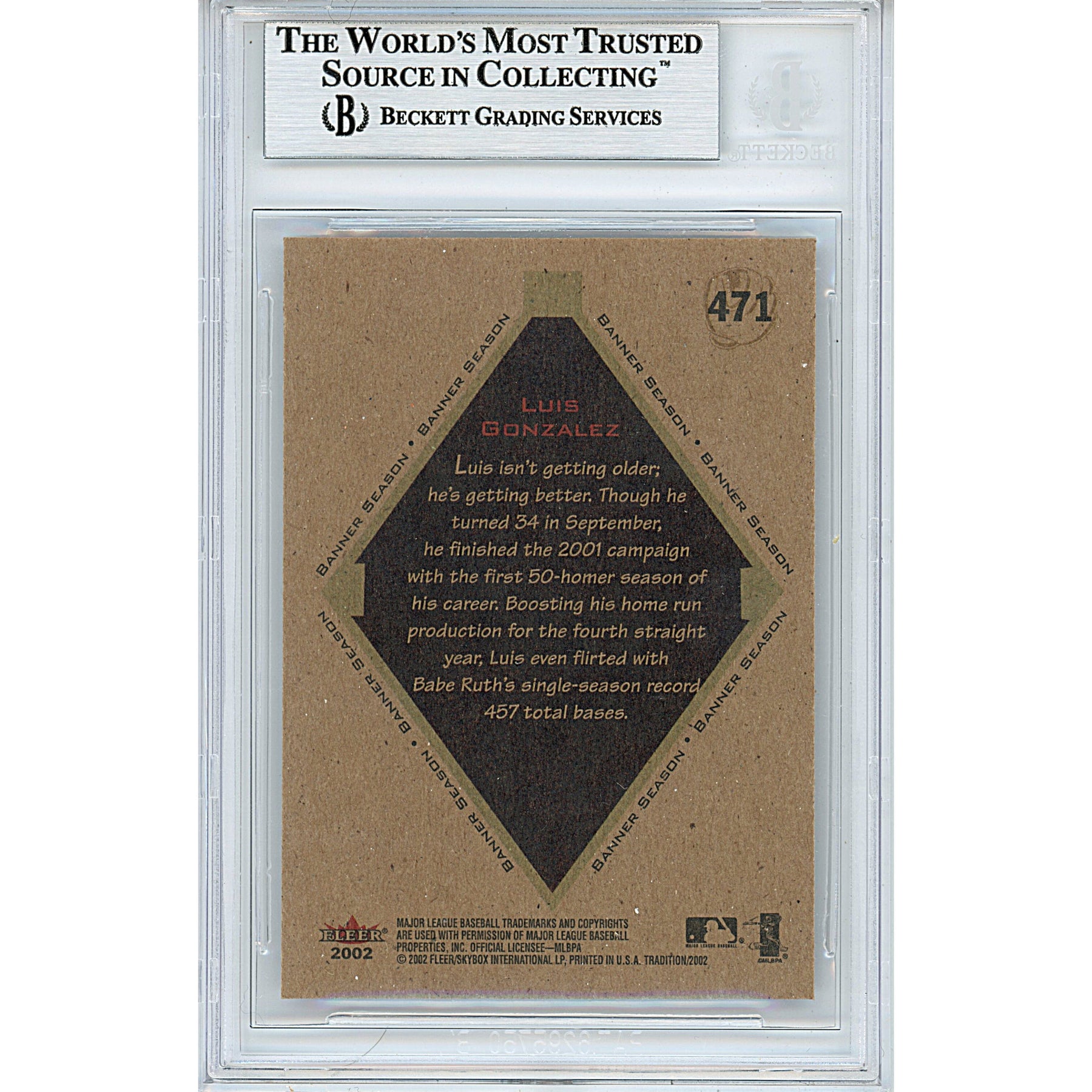 This Luis Gonzalez autographed 'Arizona Diamondbacks' 2002 Fleer Tradition baseball trading card #471 is authenticated by Beckett Authentication Services (BAS) and encapsulated in a BGS tamper proof card protector. This certification can be verified by visiting www.Beckett-Authentication.com and using the authentication number 00013191305. Please click on images to enlarge and browse our website for additional MLB and Baseball autographed collectibles. Notable career accomplishments include 5-time MLB All Star Game selection, 2001 World Series champion, 2001 MLB Silver Slugger Award winner, and having his jersey #20 retired by the Arizona Diamondbacks.