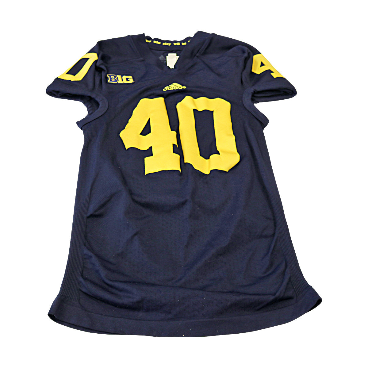 Michigan Wolverines Team Issued 2012 Blue Alternate #40 Adidas Jersey (Size XL). M on neck and Those who stay will be champions printed on neck. The nameplate has been removed.