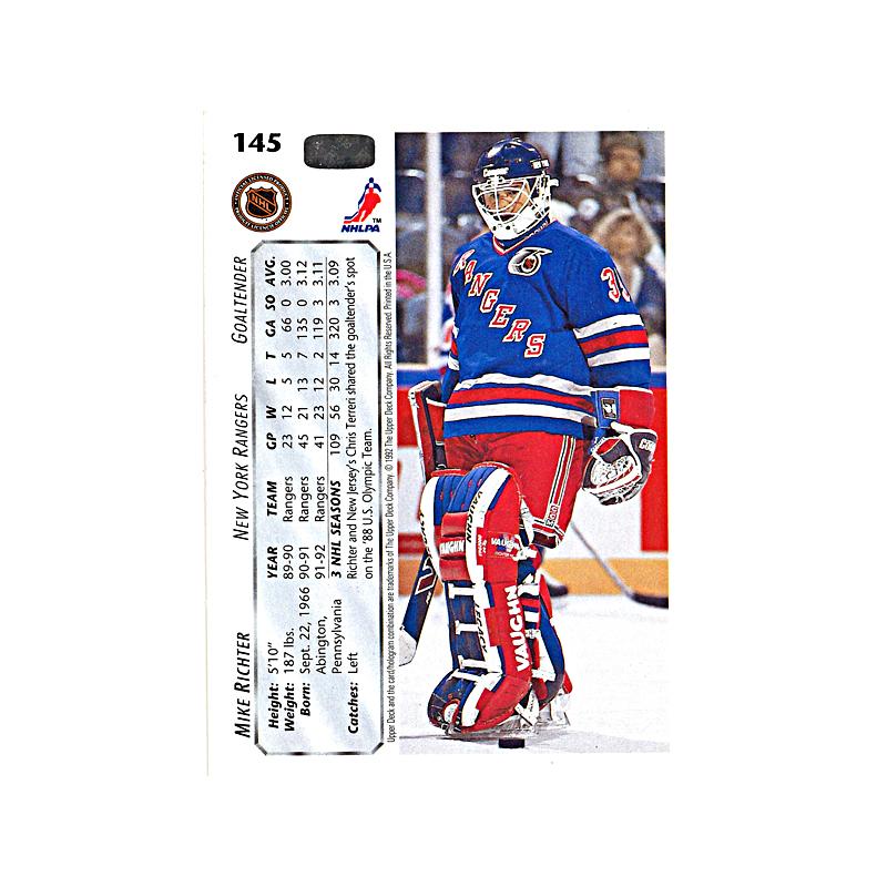 mike richter new york rangers autographed and insc. " '94 cup champs!" 1992 upper deck trading card