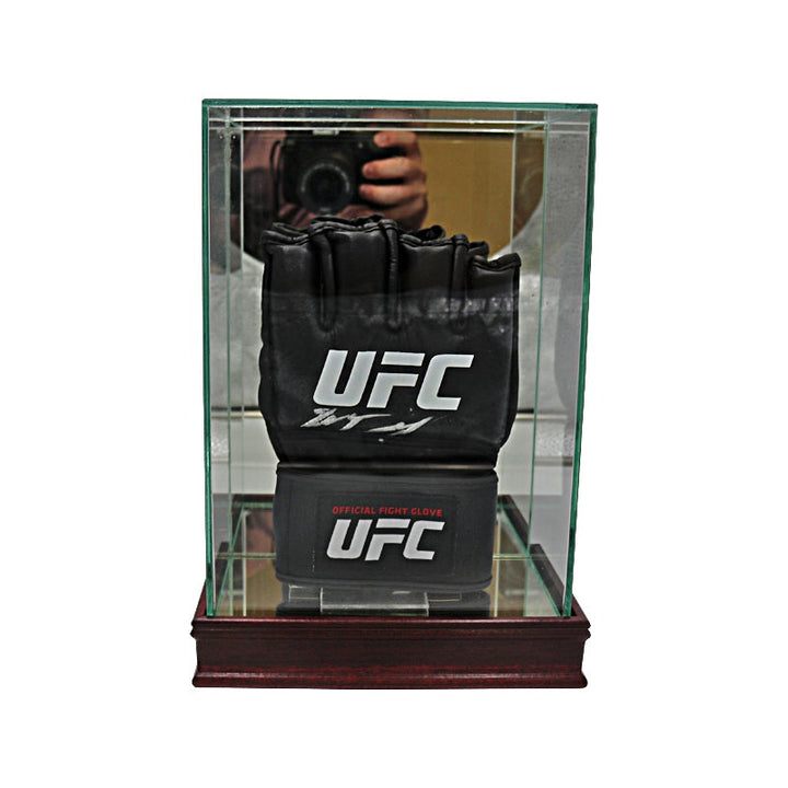 mma single glove glass case with wood base and acrylic glove stand (overall case dimensions 7" x 4" x 10")