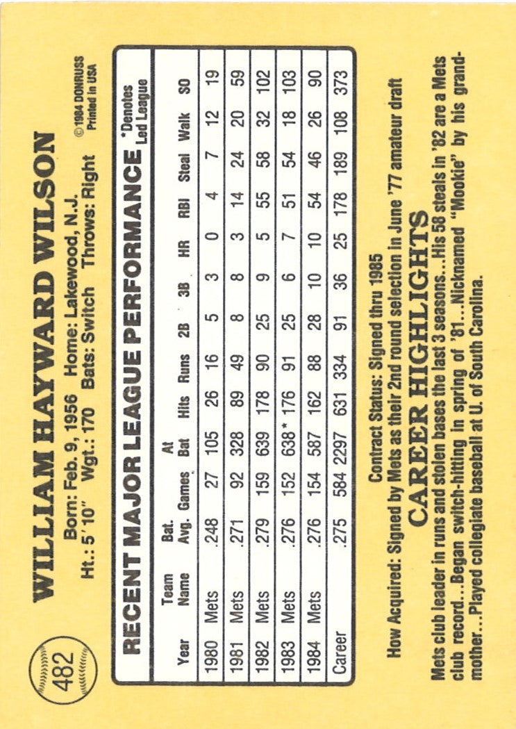 mookie wilson new york mets autographed donruss (1985-#482) trading card (CX auth)