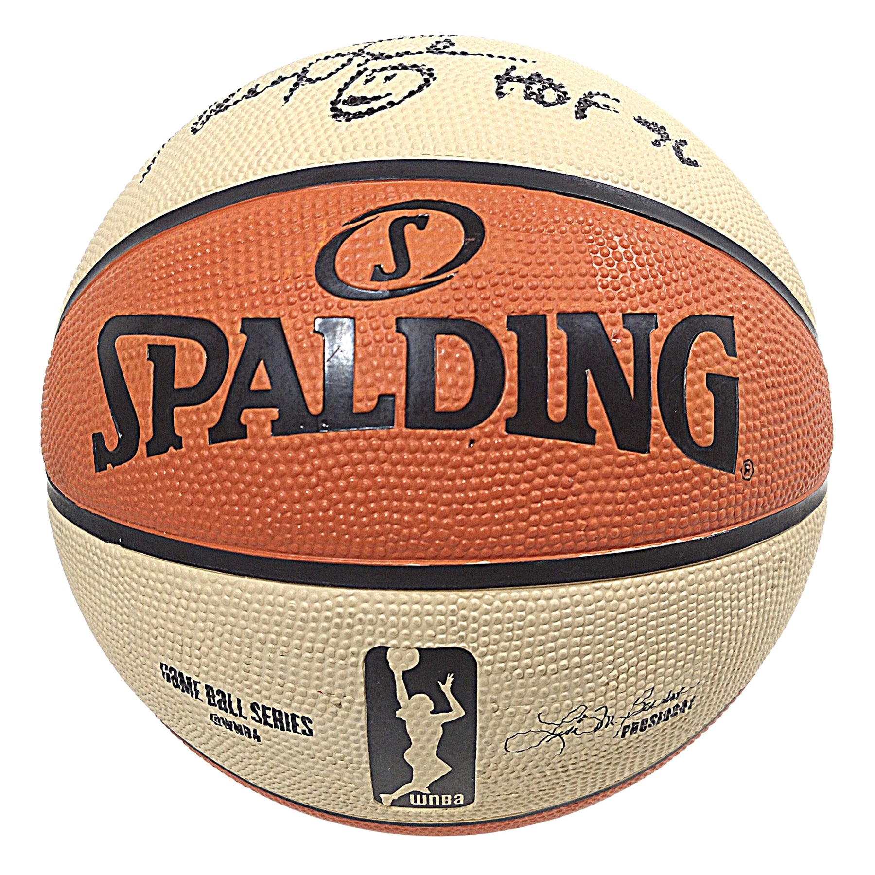 This autographed WNBA Spalding basketball, featuring a 'HOF '96' inscription, is a brand-new offering by Nancy Lieberman. In black ink, the basketball has been signed by Nancy Lieberman herself. A photo is included at no additional cost to prove that Nancy Lieberman signed this very basketball for us. Beckett Authentication Services (BAS) has certified and verified this signature as genuine and authentic, and proof of this can be found by using authentication number A90904 at www.Beckett-Authentication.com. Please click on photos for a closer look. To see more of our autographed collectibles from the WNBA and NCAA, please visit our website. Nancy Lieberman's incredible basketball career includes being inducted into the Naismith National Basketball Hall of Fame in 1996, being drafted in the second round (#15 overall) in the 1997 WNBA Draft, and playing professionally for the Phoenix Mercury and Detroit Shock. She also played for the Old Dominion Lady Monarchs.