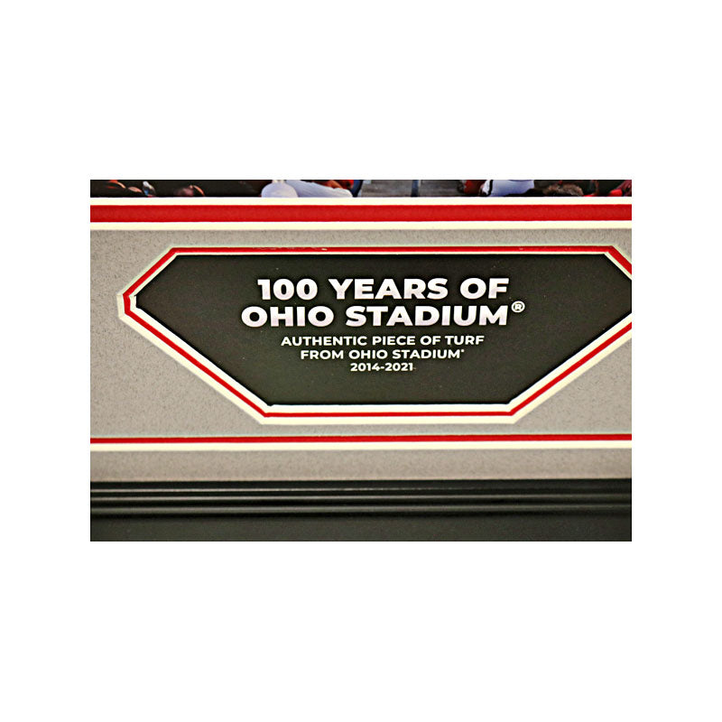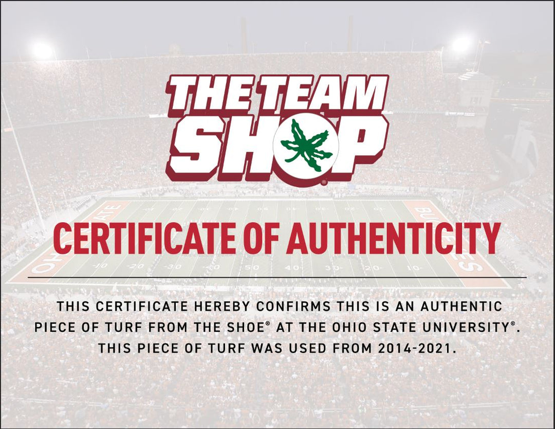 For 100 years, Ohio Stadium has been one of the most storied college football stadiums in America. This amazing Ohio State collectible contains a piece of authentic Ohio Stadium turf used from 2014 - 2021. The frame measures 18"x28" and has the turf mounted to the outside of the frame, so you can touch and feel the stadium field that your favorite players have played on. Item is accompanied by an Ohio State hologram and Letter of Authenticity.