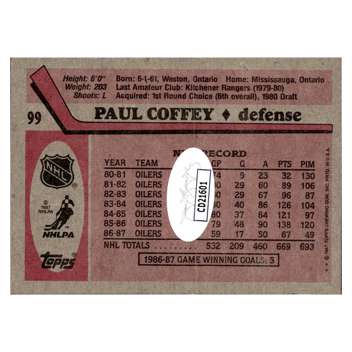 Paul Coffey Edmonton Oilers Autographed Signed 1987 Topps (JSA COA #CD21601)