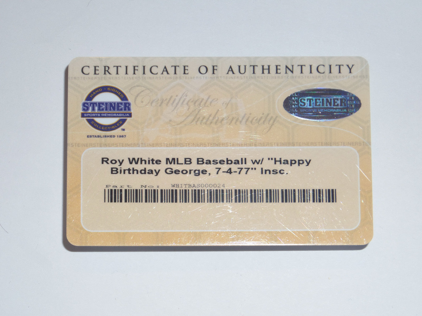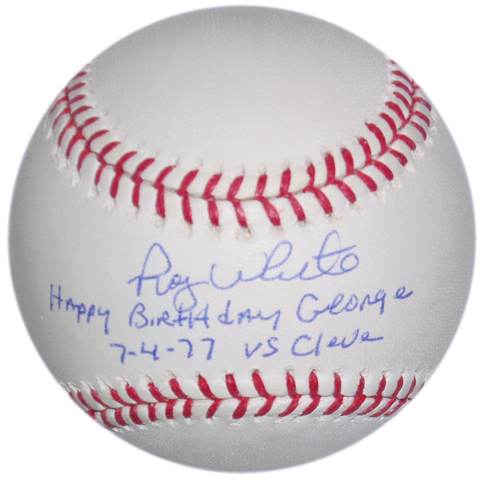 ROY WHITE SIGNED OML BALL "HAPPY BIRTHDAY GEORGE 7-4-77 vs CLEVE" STEINBRENNER