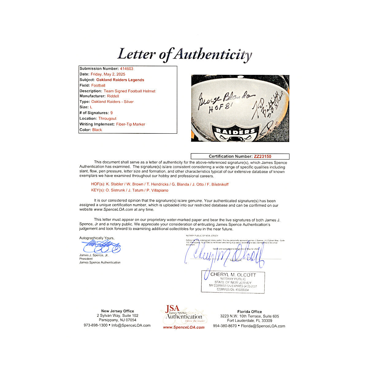 Authenticated by James Spence Authentication (JSA) with certification number ZZ23150, all autographs have been reviewed and certified as genuine. This helmet represents a dominant era of Raiders football and makes an ideal display piece for fans of the Silver and Black.