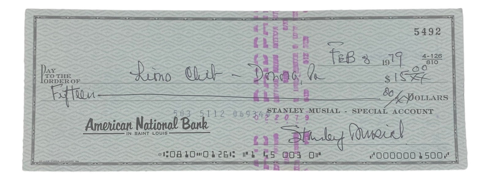stan musial st. louis cardinals signed bank check #5492 BAS