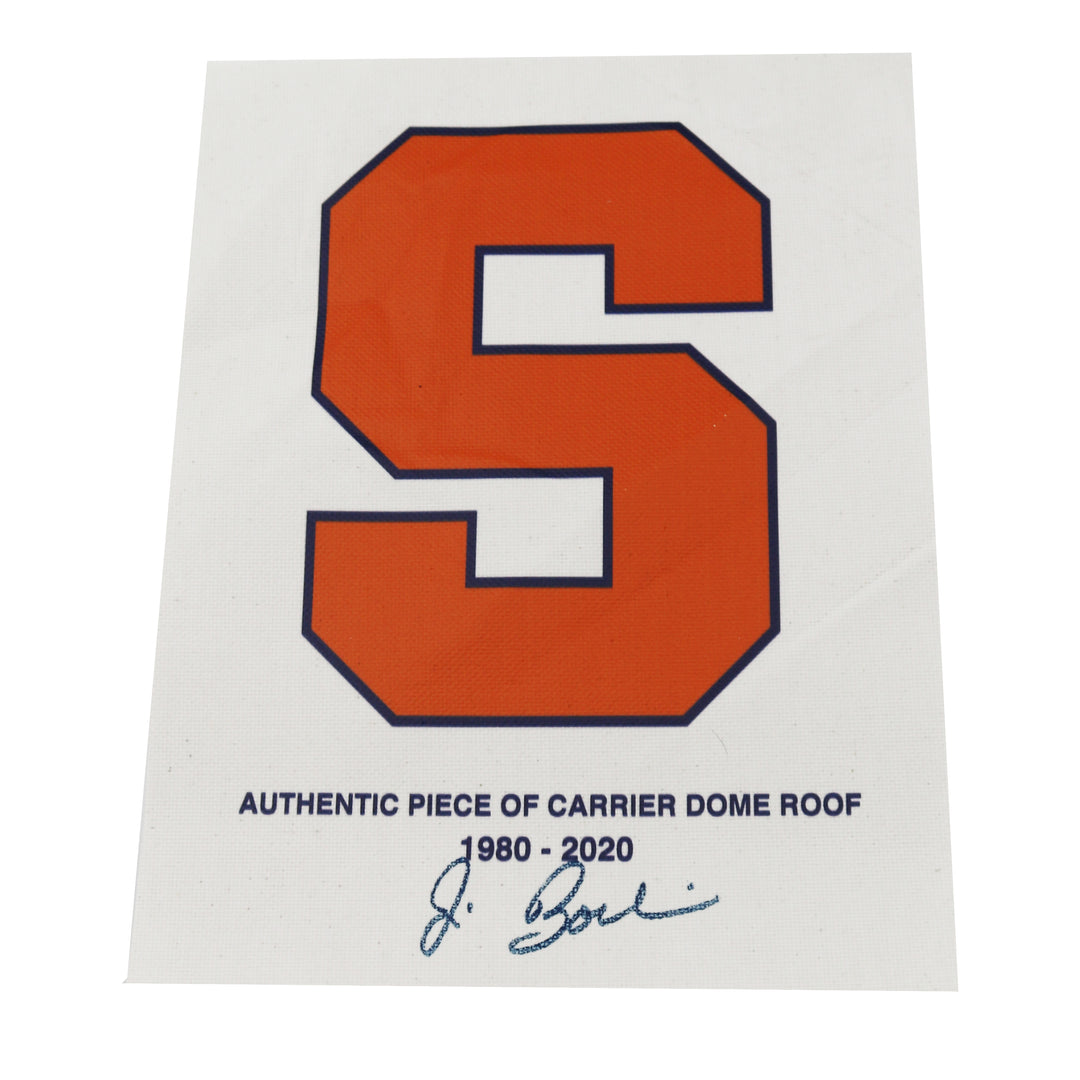 This is an authentic piece of the historic Syracuse University Carrier Dome roof adorned with the famous orange Syracuse S and autographed by Coach Jim Boeheim. The Bubble covered the iconic structure from 1980-2020. Due to the outside elements there could be some creases and or weather spots on the roof pieces.