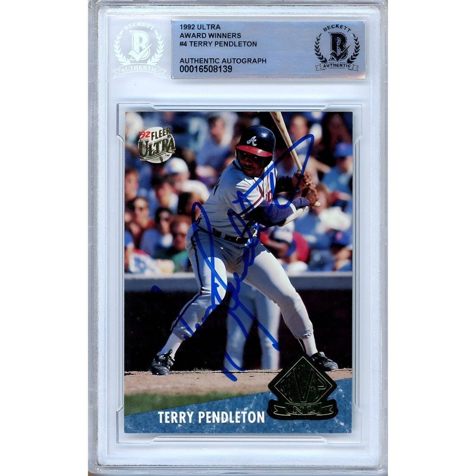 Experience owning a piece of history with the rare and valuable Terry Pendleton autographed 1992 Fleer Ultra Award Winner Card #4. This high-quality card features an authenticated autograph from the esteemed Atlanta Braves player and is made with premium card stock material. Authenticated and encapsulated by Beckett Authentication Services (BAS) with certificate number 00016508139, this vintage piece from the 1992 Fleer Ultra set is officially licensed and in standard trading card size. Don't miss out on owning this highly coveted hard-signed sports trading card, a true gem for any baseball fan and Atlanta Braves enthusiast.