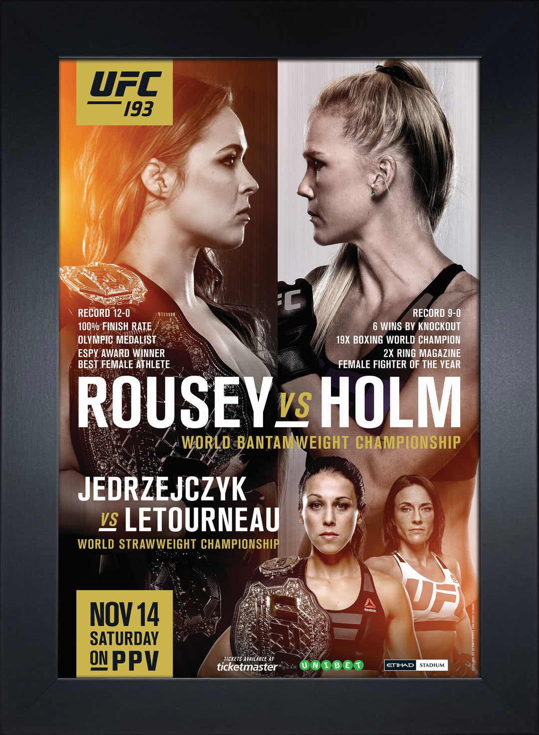 This 9" x 13" replica UFC 193 event poster is printed and framed in a handsome flat black frame. The result is a beautiful piece of UFC history that can be hung right on your wall as is.
