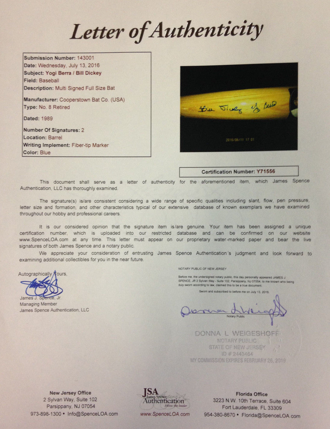yogi berra bill dickey signed cooperstown baseball bat auto HOF le /202 JSA COA